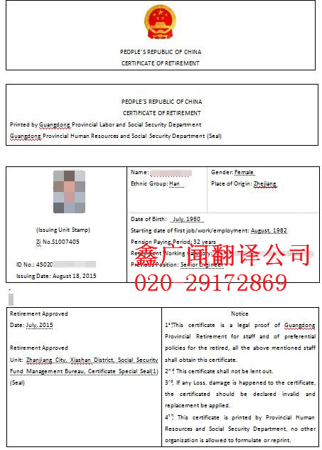 鑫廣聞廣州翻譯公司的員工本著“成就客戶、專業(yè)誠(chéng)信、求實(shí)創(chuàng)新、穩(wěn)健和諧、立即行動(dòng)”的企業(yè)文化精神,及時(shí)響應(yīng)客戶的需求,贏得了客戶良好的口碑。鑫廣聞翻譯公司是專業(yè)大型的翻譯公司,提供各類證件翻譯。鑫廣聞翻譯提供退休證翻譯模板供大家參閱。