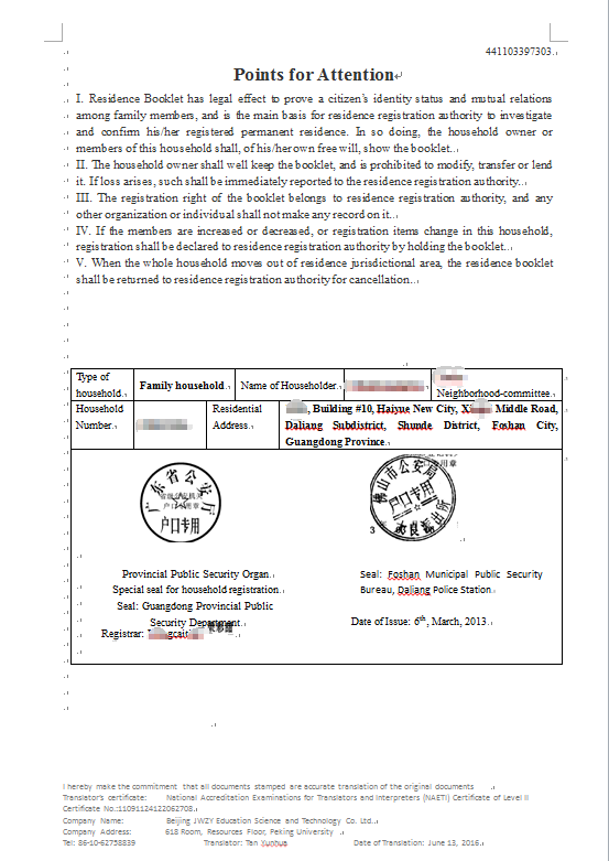 戶口本翻譯樣本,簽證戶口本英語翻譯模板,簽證戶口簿英文翻譯,時(shí)還應(yīng)該有身份證翻譯,駕駛證翻譯資料等